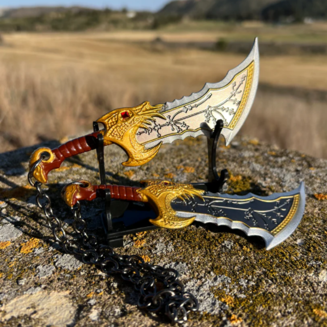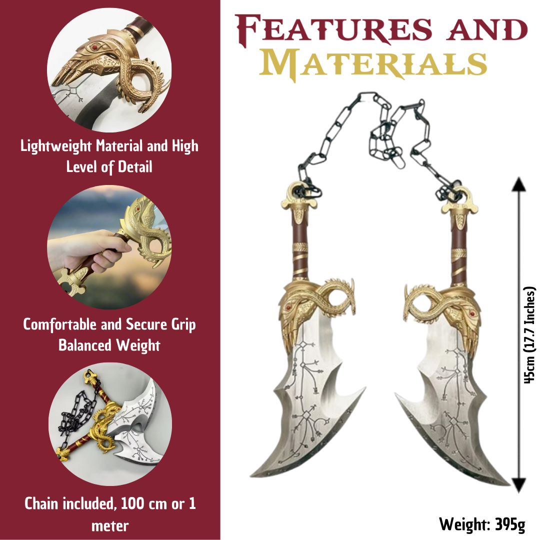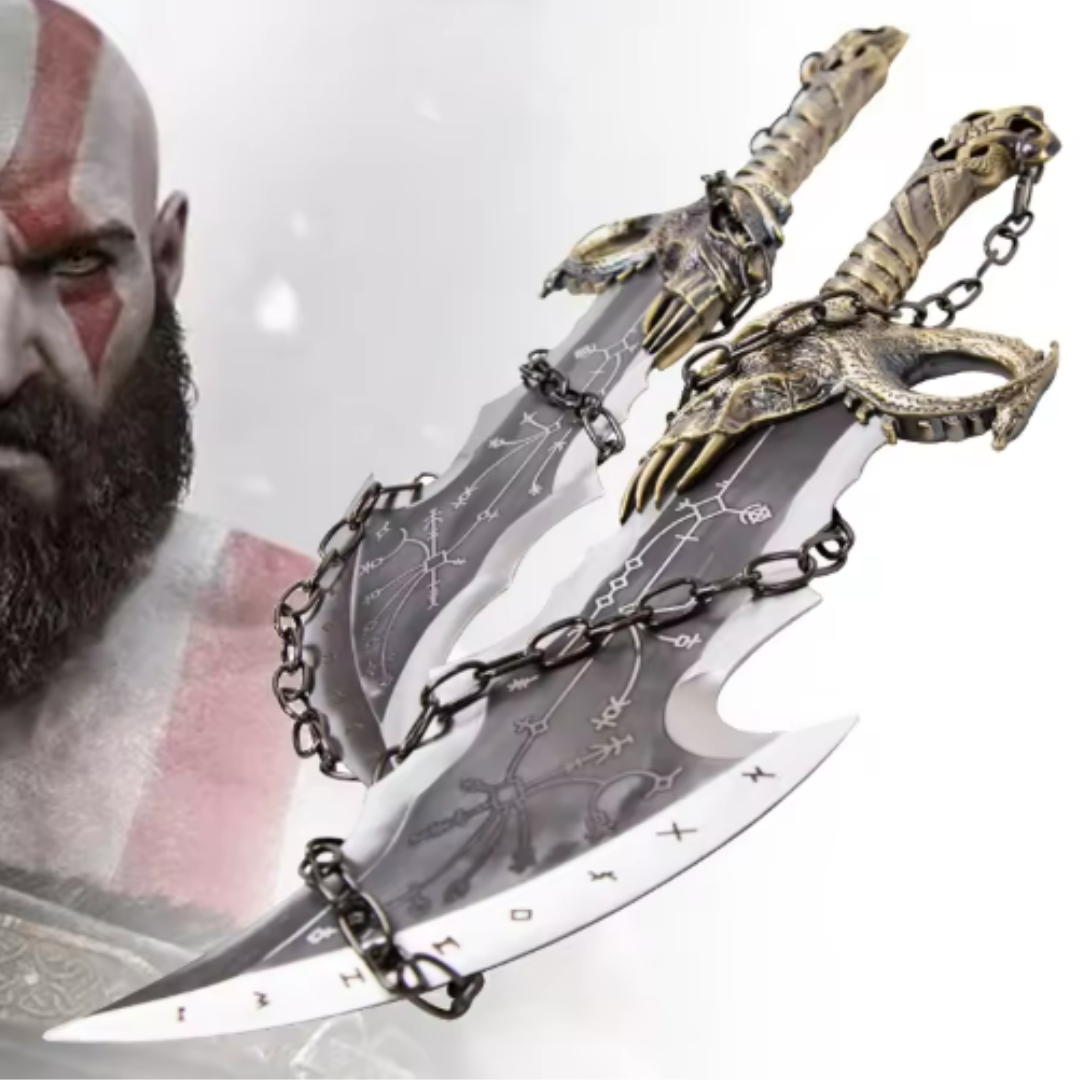 Our Full-size replica of the Blades of Chaos (45 cm) is perfect for cosplay, display, or collecting. Lightweight and safe for easy handling, it brings the legendary swords to life on an epic scale.